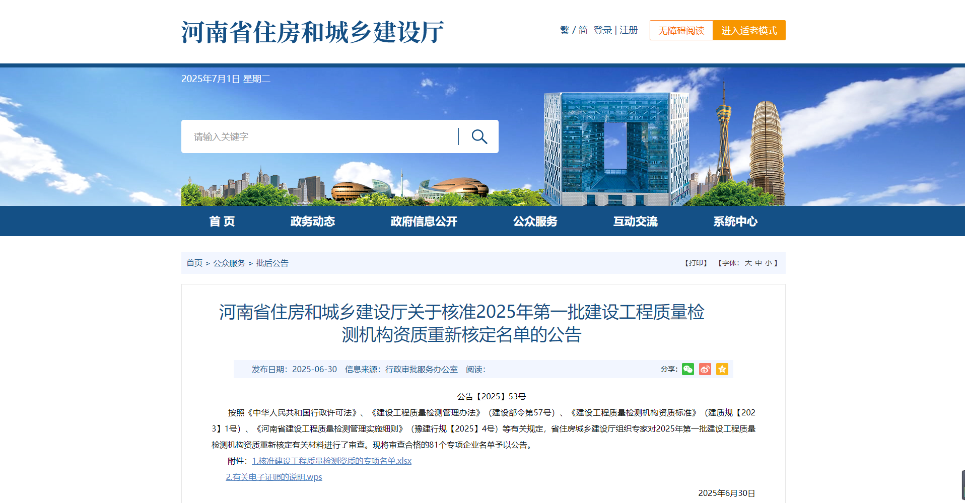 熱烈祝賀我司通過河南省住建廳2025年第一批建設工程質量檢測機構資質重新核定!??!